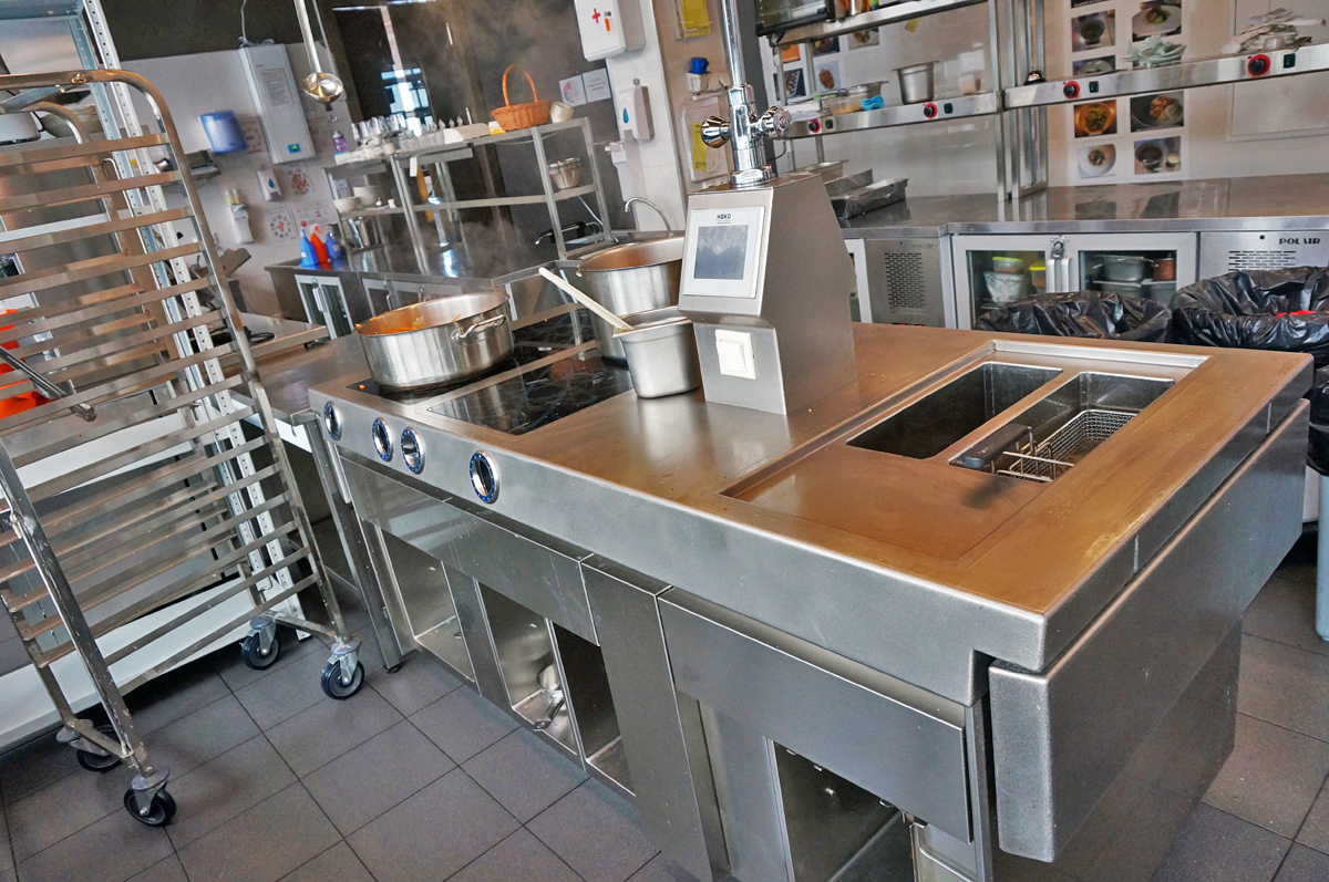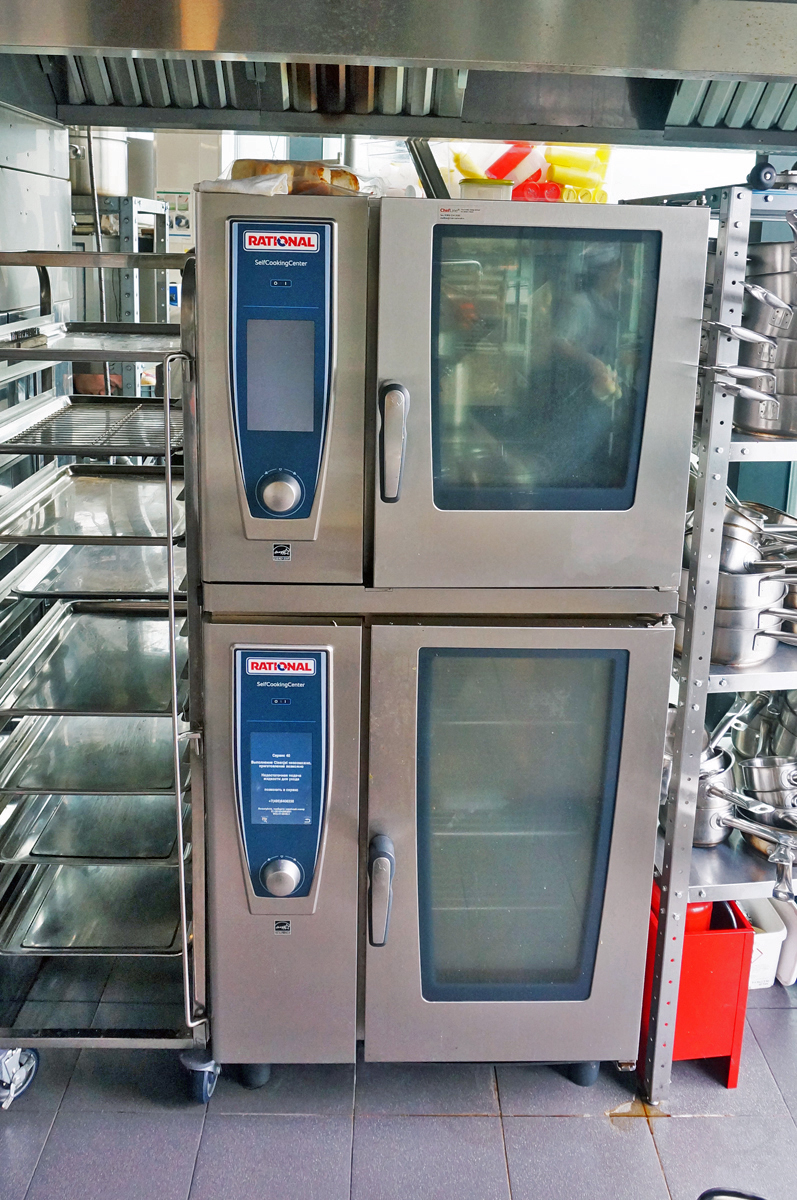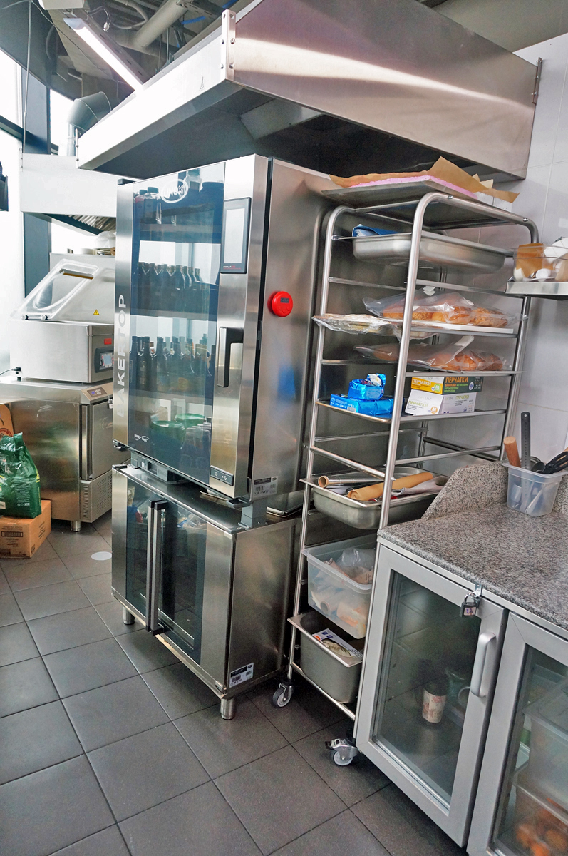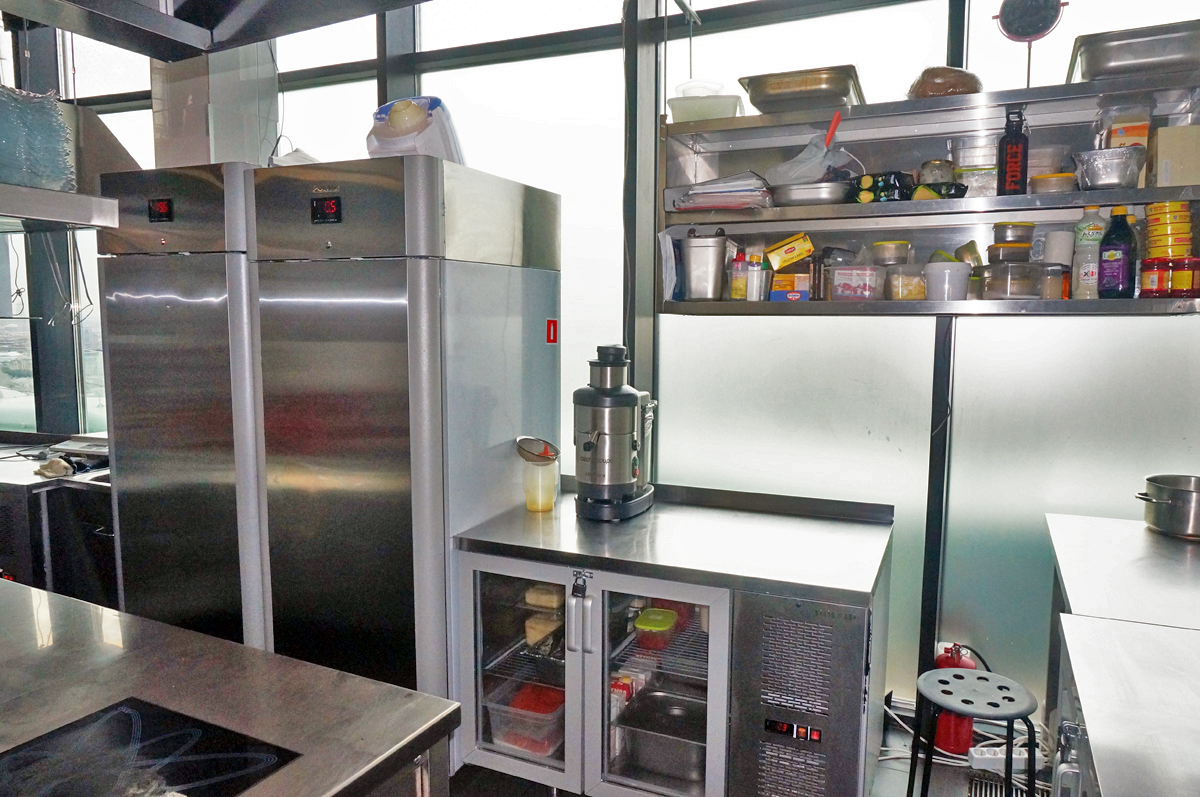 Кухня ресторана расположена в подвале (складские и заготовочные цеха) и на 22 этаже, связь между которыми обеспечивается лифтами. Конфигурация здания овальной формы с витринным остеклением определило уникальное проектное решение кухни. Отсутствие стен по периметру определило потолочное крепление многих элементов кухни и расположение тепловых островов в центре помещения. Три тепловых острова являются цельными конструкциями, каждый из которых продуман и спроектирован исходя из задач шеф повара и меню ресторана. Для решения данной задачи был выбран HEKO от производителя Emainox– компания, которая специализируется на разработке и производстве встроенных электрических индукционных кухонных приборов. Они отличаются высокой экономией энергии и низкими эксплуатационными расходами. Встроенные кухни и модули HEKO комфортны в использовании, выполнены из качественных материалов, обеспечивающих привлекательный внешний вид и высокую гигиену. Толщина стали, используемой для плит – 5 мм. Дополнительно, проектным решением, острова оборудованы нейтральными вставками для увеличения рабочей поверхности, которые можно откидывать или убирать по необходимости. Обязательным атрибутом горячего цеха являются пароконвектоматы RATIONAL, которые для экономии пространства, установлены друг на друга.