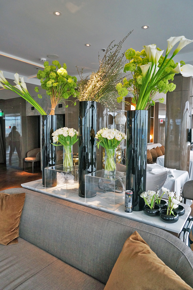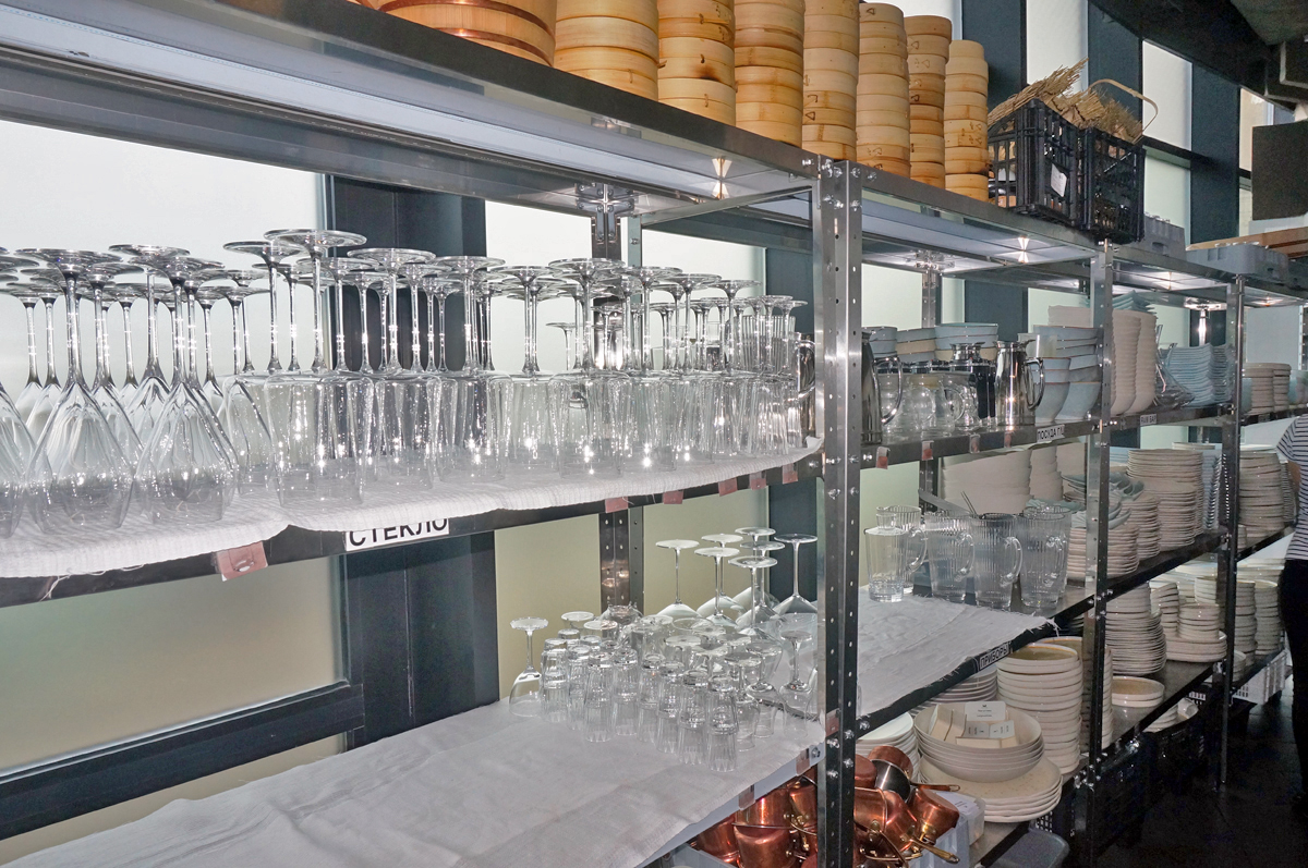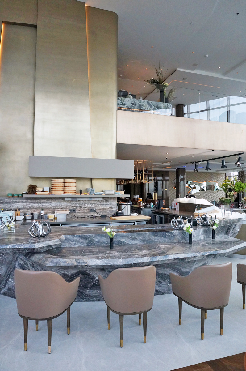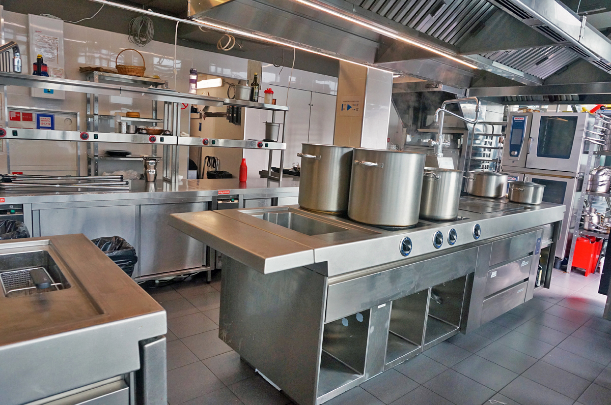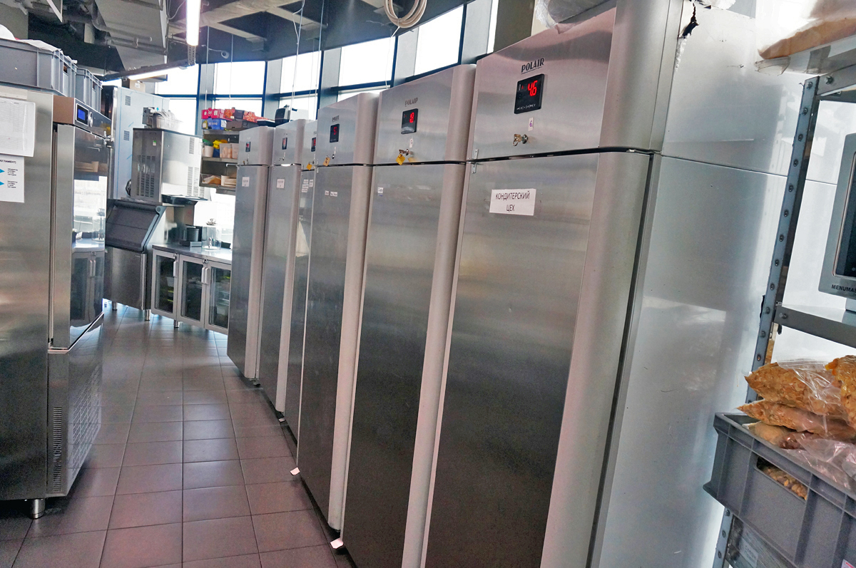 Кухня ресторана расположена в подвале (складские и заготовочные цеха) и на 22 этаже, связь между которыми обеспечивается лифтами. Конфигурация здания овальной формы с витринным остеклением определило уникальное проектное решение кухни. Отсутствие стен по периметру определило потолочное крепление многих элементов кухни и расположение тепловых островов в центре помещения. Три тепловых острова являются цельными конструкциями, каждый из которых продуман и спроектирован исходя из задач шеф повара и меню ресторана. Для решения данной задачи был выбран HEKO от производителя Emainox– компания, которая специализируется на разработке и производстве встроенных электрических индукционных кухонных приборов. Они отличаются высокой экономией энергии и низкими эксплуатационными расходами. Встроенные кухни и модули HEKO комфортны в использовании, выполнены из качественных материалов, обеспечивающих привлекательный внешний вид и высокую гигиену. Толщина стали, используемой для плит – 5 мм. Дополнительно, проектным решением, острова оборудованы нейтральными вставками для увеличения рабочей поверхности, которые можно откидывать или убирать по необходимости. Обязательным атрибутом горячего цеха являются пароконвектоматы RATIONAL, которые для экономии пространства, установлены друг на друга.
