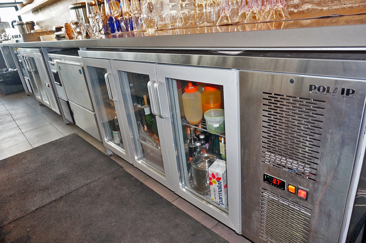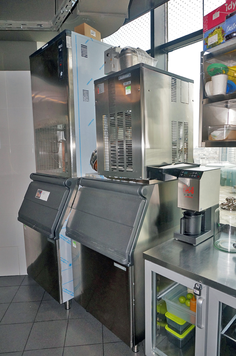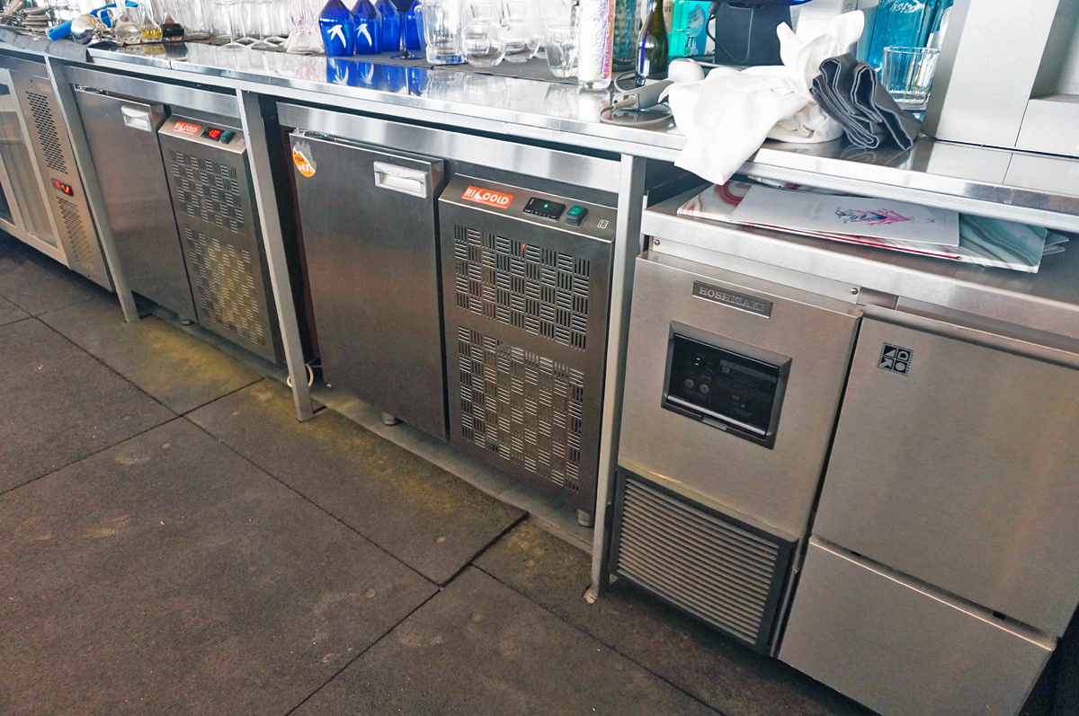 Сердце ресторана - Row bar c ледником, каменной столешницей и дизайнерской витриной для выкладки рыбы, где гости могут выбрать морепродукты на свой вкус. Необходимый объем и качество льда обеспечивают льдогенераторы Hoshizaki для гранулированного и кубкового льда. Дополнительно в зоне кухни установлено несколько льдогенераторов Scotsman, для снабжения льдом открытой витрины и нужд бара. Для приготовления суши прекрасно справляется со своей задачей рисоварка Indokor.