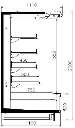 Модель | Температурный диапазон, С | Объем выкладки, м3 | Площаль выкладки, м2 | Вес, кг | Габаритные размеры, мм | Оттайка, Вт | Холодопотребление, Вт |