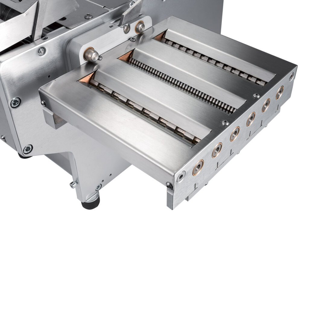 Резка по длине регулируется путём таймера. Форматы лапши: mm 2, 4, 6, 8, 12, 24 и с волнистым краем. 2. Насадка для равиоли позволяет приготовить равиоли, склеены друг с другом, различного формата и с пастообразной начинкой (мясо, сыр, овощи, ...) 3. Насадка для ньокки позволяет готовить картофельные или мучные ньокки различного размера. Насадка легко присоединяется к машинам.
