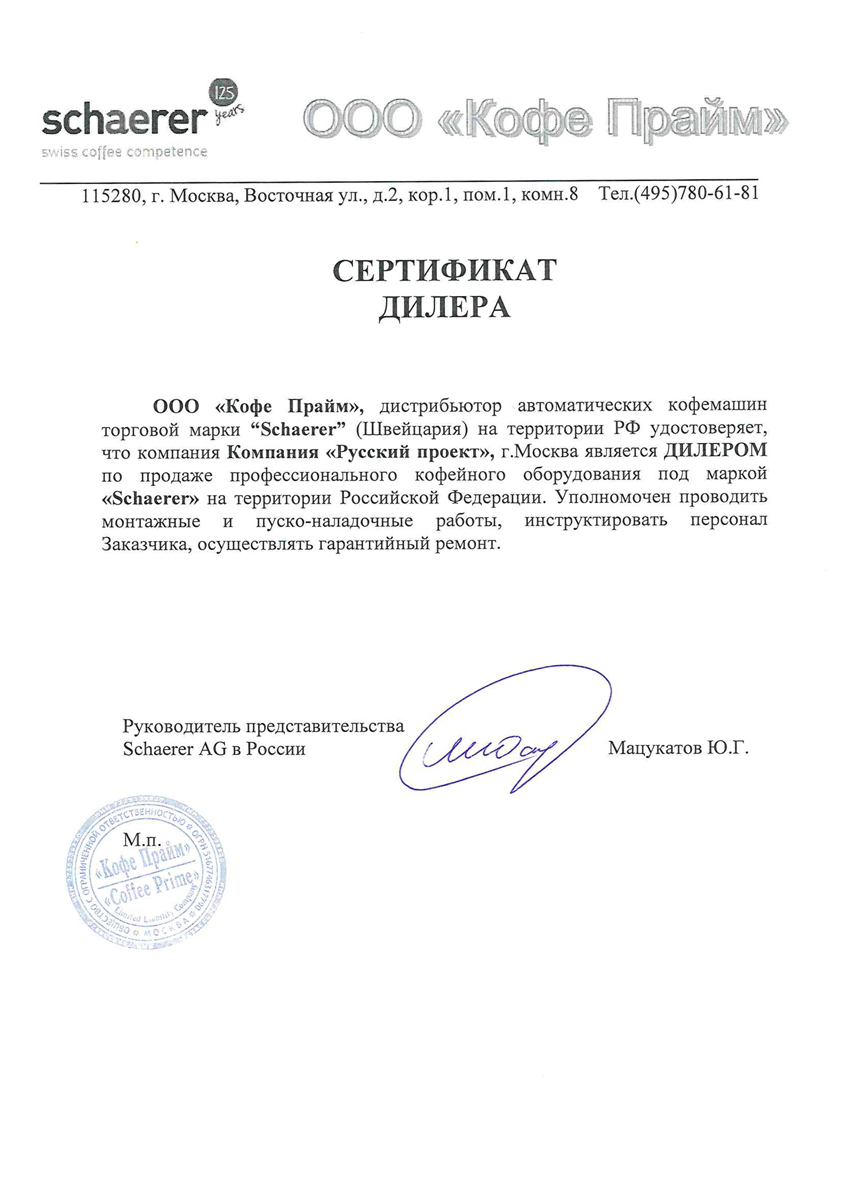 «Русский Проект» ® - Официальный дилер SCHAERER на территории РоссииО компанииSchaerer — швейцарская компания, по производству автоматических профессиональных кофемашин высочайшего качества. Завод компании Schaerer расположен в Швейцарии в Цухвиле, филиалы находятся в Германии и США, многочисленные партнеры – по всему миру.