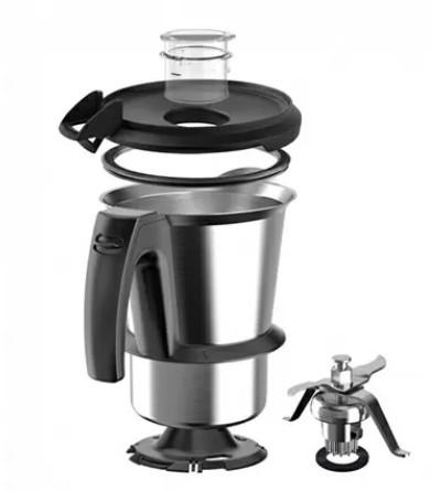 Кувшин имеет тройное покрытие из стали и алюминия. Он оснащен крышкой, которая облегчает постепенное добавление продуктов, удобным мерным стаканчиком и высококачественным ножом с четырьмя лезвиями из нержавеющей стали, который легко снимается для чистки. Он также оснащен ручкой с надежной системой крепления для дополнительной безопасности.